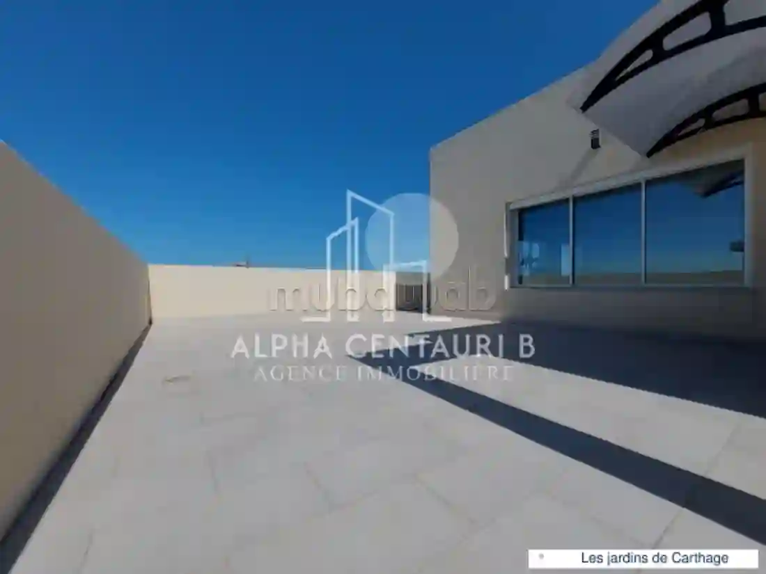Alpha Centauri vous propose à la vente un somptueux Penthouse en S3. Situé dans une résidence moderne et récemment construite aux Jardins de Carthage. La partie jour comprend : Un vaste espace de vie lumineux, donnant accès à une superbe terrasse de 120 m². Une salle de bain pour les invités. Une cuisine équipée. La partie nuit vous découvrirez : Deux suites juniors. Une spacieuse master suite avec salle de bain privative. Le Penthouse est équipé et dispose de : Chauffage central. Climatisation Split-system. Deux places de parking sous-sol et un cellier. Contactez-nous dès maintenant pour de plus amples informations ou pour planifier une visite.