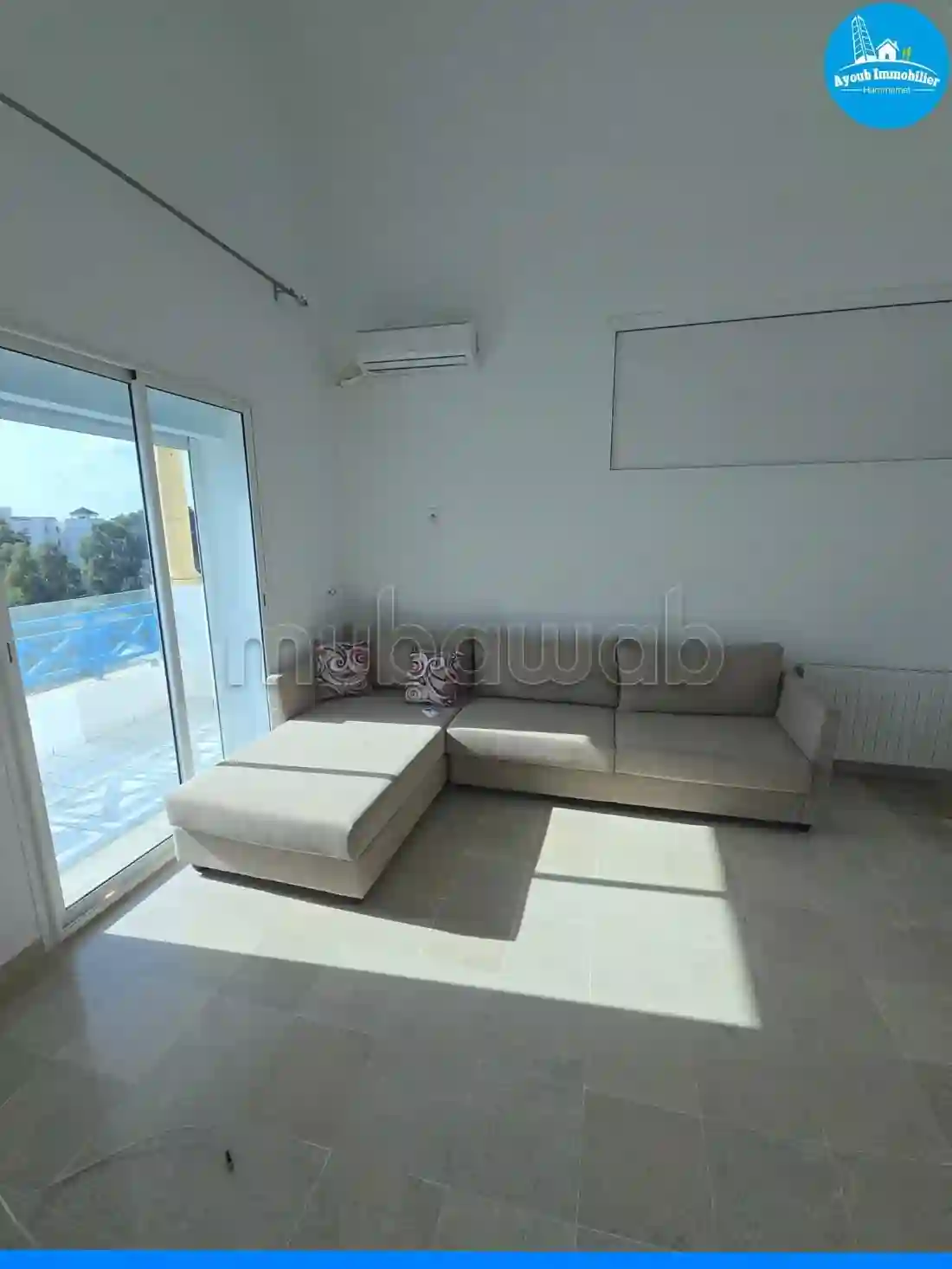 En Exclusivité chez Ayoub immobilier. Bel appartement à louer à l'année au dernier étage d'une résidence juste en face de Hôtel Radisson blue. L'appartement se caractérise par une vue splendide sur la mer et il se compose de 2 chambres à coucher, une salle de bain, un salon donnant sur une terrasse et une cuisine équipée avec séchoir. L'appartement bénéficie aussi d'une place de parking au sous-sol et un ascenseur. Prix 1500dt par mois.
