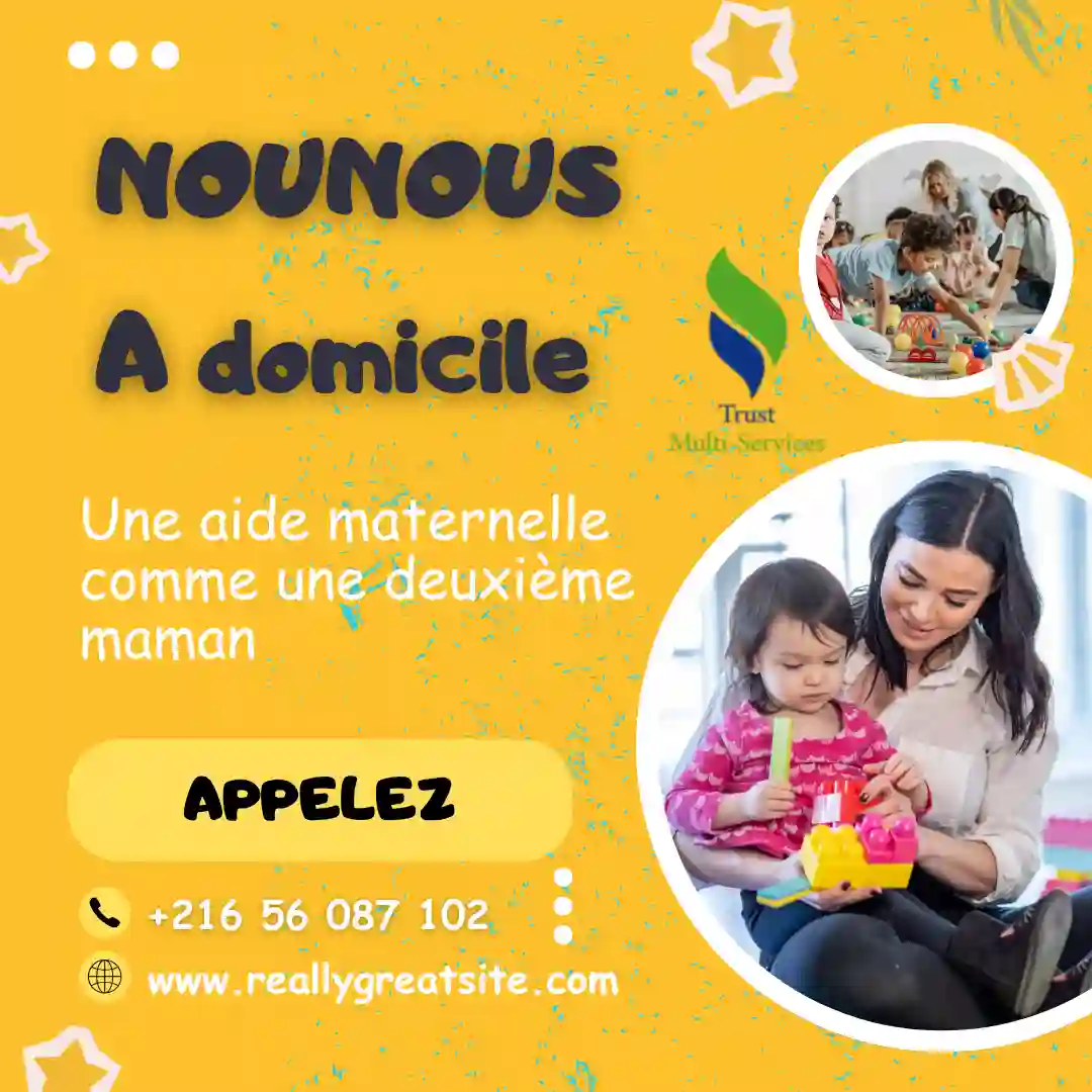 Vous cherchez une nounou expérimentée et de confiance pour s’occuper de vos enfants à domicile, chaque mois ? Chez Trust Multiservices, nous vous proposons des professionnelles qualifiées, disponibles et attentives aux besoins de votre famille. Profitez d’un service personnalisé, flexible et sécurisé pour la garde de vos enfants. Contactez-nous dès maintenant au 56087102 ou 27333627 et facilitez votre quotidien avec Trust Multiservices !