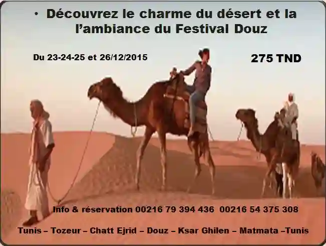 Adresse : 4260 Douz Douz Kebili Bungalow à louer à Douz Découvrez le charme du désert et l'ambiance du festival Douz du 23 au 26/12/2015 avec notre groupe. Le circuit sera : Tunis - Tozeur - Douz - Ksar Ghilen - Matmata - Tunis