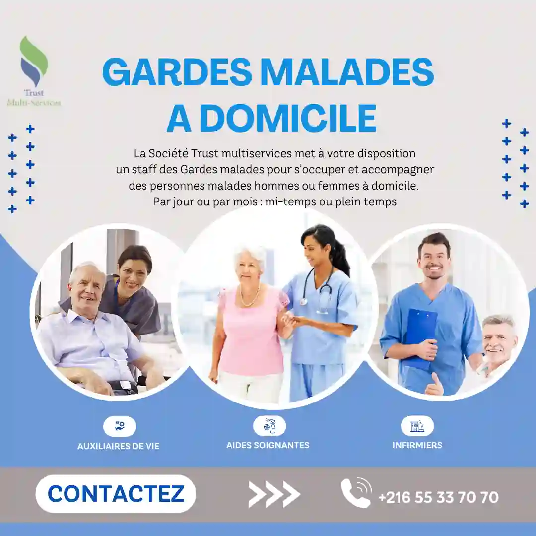 "Vous avez besoin d’un(e) : Garde Malade ( Homme/Femme ) à domicile par Mois OU Garde Jour OU Garde Nuit ? Appelez le 📞 55.33.70.70 📞 24.606.205"