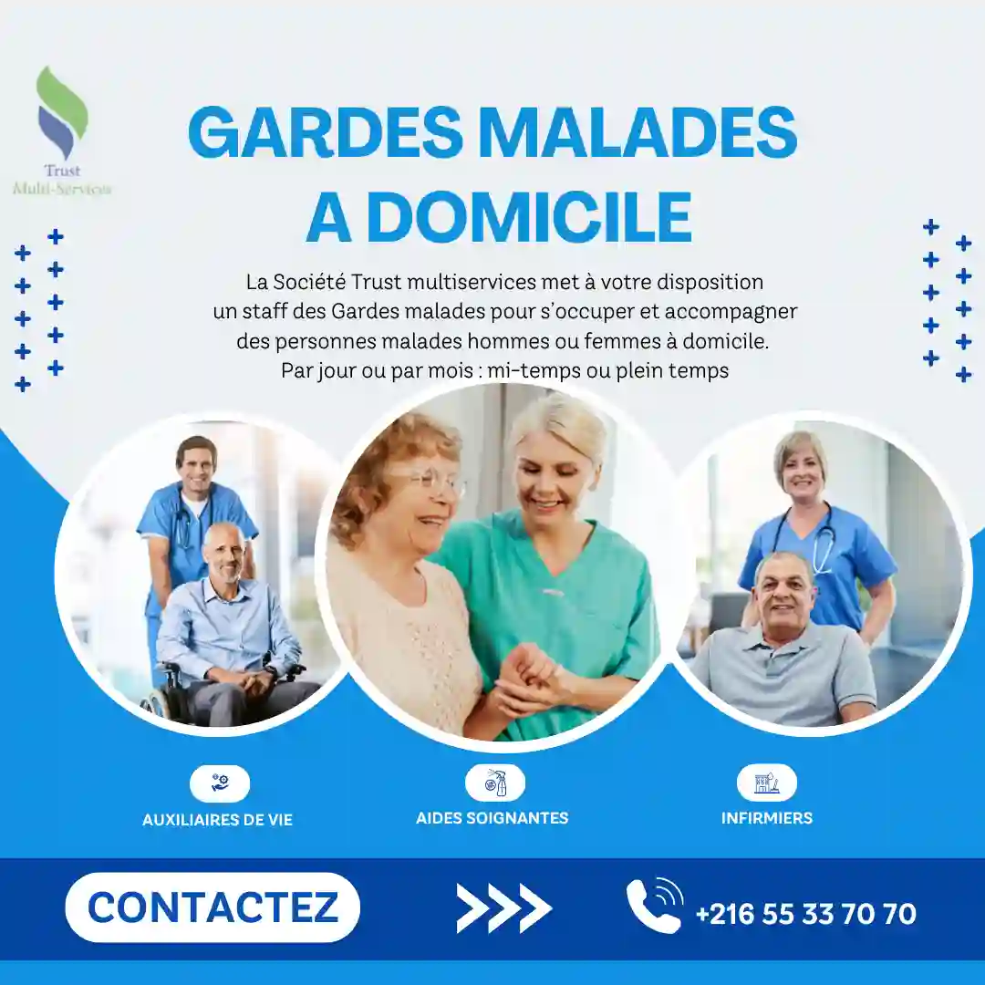 "Vous avez besoin d’un(e) : Garde Malade ( Homme/Femme ) à domicile par Mois OU Garde Jour OU Garde Nuit ? Appelez le 📞 55.33.70.70 📞 24.606.205"