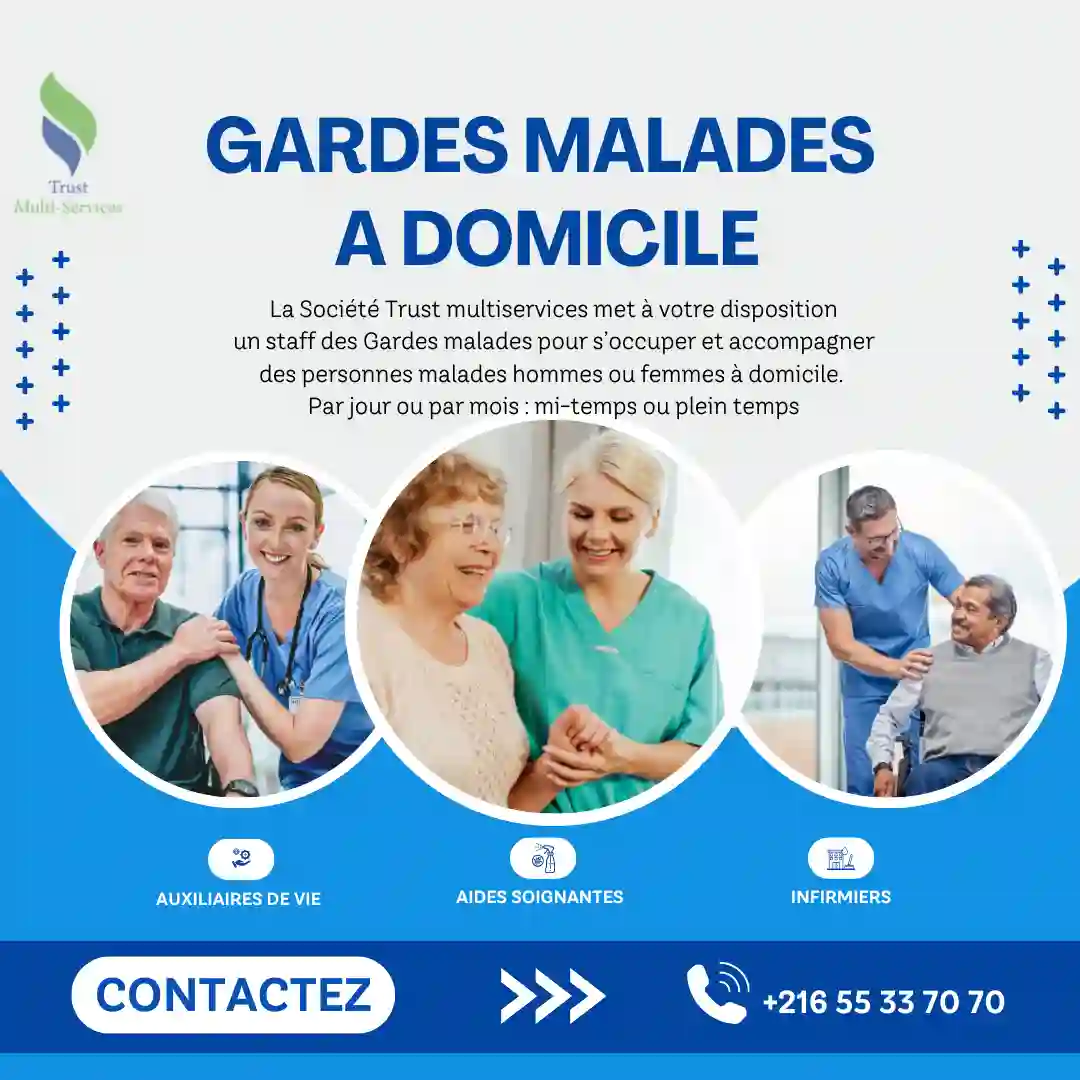 "Vous avez besoin d’un(e) : Garde Malade ( Homme/Femme ) à domicile par Mois OU Garde Jour OU Garde Nuit ? Appelez le 📞 55.33.70.70 📞 24.606.205"