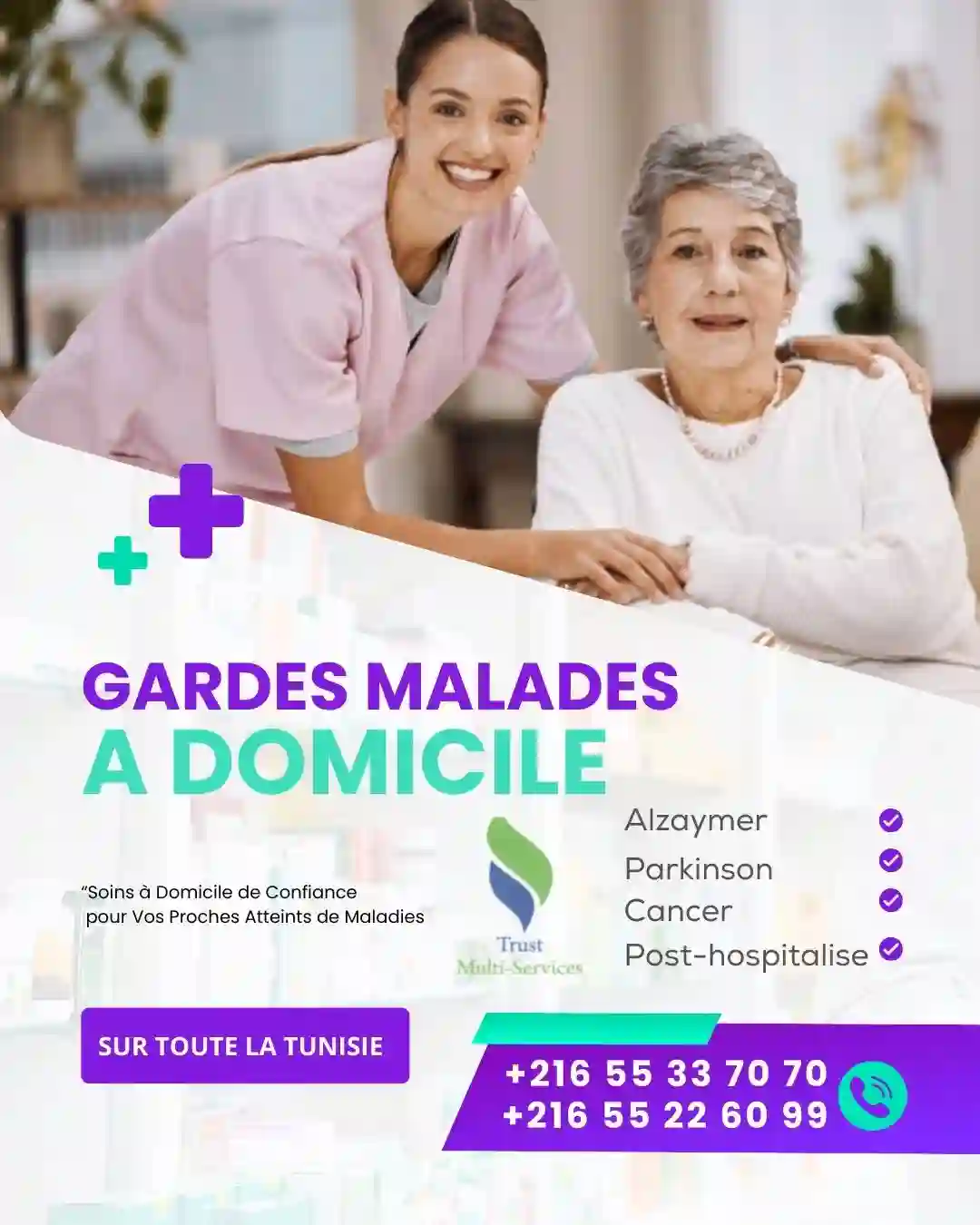 "Vous avez besoin d’un(e) : Garde Malade ( Homme/Femme ) à domicile par Mois OU Garde Jour OU Garde Nuit ? Appelez le 📞 24. 606.205 📞 55.33.70.70"