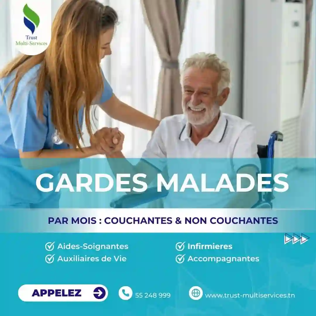 "🌟 Besoin d'une garde malade de confiance en Tunisie ? 🌟 Votre santé et celle de vos proches méritent toute l’attention du monde. Chez [Nom de votre service], nous mettons à votre disposition des gardes malades professionnelles, qualifiées et bienveillantes, prêtes à accompagner vos proches à domicile, à l’hôpital ou en centre médical. 💙 Nos engagements : ✔️ Assistance 24h/24 et 7j/7 ✔️ Personnel formé et expérimenté ✔️ Présence humaine, écoute et respect ✔️ Suivi personnalisé selon l’état de santé ✔️ Intervention rapide dans toute la Tunisie Qu’il s’agisse d’un besoin temporaire ou d’un accompagnement de longue durée, nous sommes là pour vous soulager et rassurer. 📞 Contactez-nous dès maintenant pour un devis gratuit ou plus d’informations. Votre sérénité est notre priorité. 📞55248999 – 24266000 www.trust-multiservices.tn "
