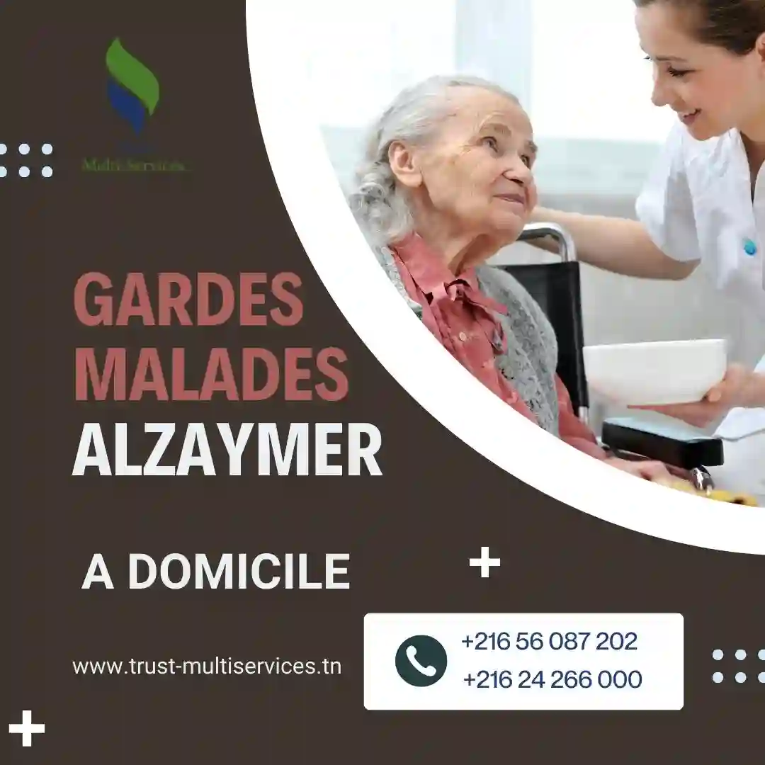 "🧠 Vous cherchez un professionnel pour accompagner un proche atteint d'Alzheimer ? 👩⚕️ Optez pour une garde-malade spécialisée à domicile, partout en Tunisie. La maladie d'Alzheimer demande une attention constante, de la patience et surtout des soins adaptés. C’est pourquoi nous mettons à votre disposition des garde-malades formés, expérimentés et bienveillants, pour un accompagnement mensuel à domicile. ✅ Surveillance 24h/24 ou selon vos besoins ✅ Aide à la toilette, à l’alimentation, et à la mobilité ✅ Stimulation cognitive adaptée ✅ Présence rassurante et soutien moral ✅ Service disponible partout en Tunisie 🎯 Offrez à vos proches le confort de rester chez eux, en toute sécurité. 📞 Contactez-nous dès aujourd’hui pour un devis personnalisé ou plus d'informations. 📞56087202 – 24266000 www.trust-multiservices.tn Votre tranquillité d’esprit commence ici. "