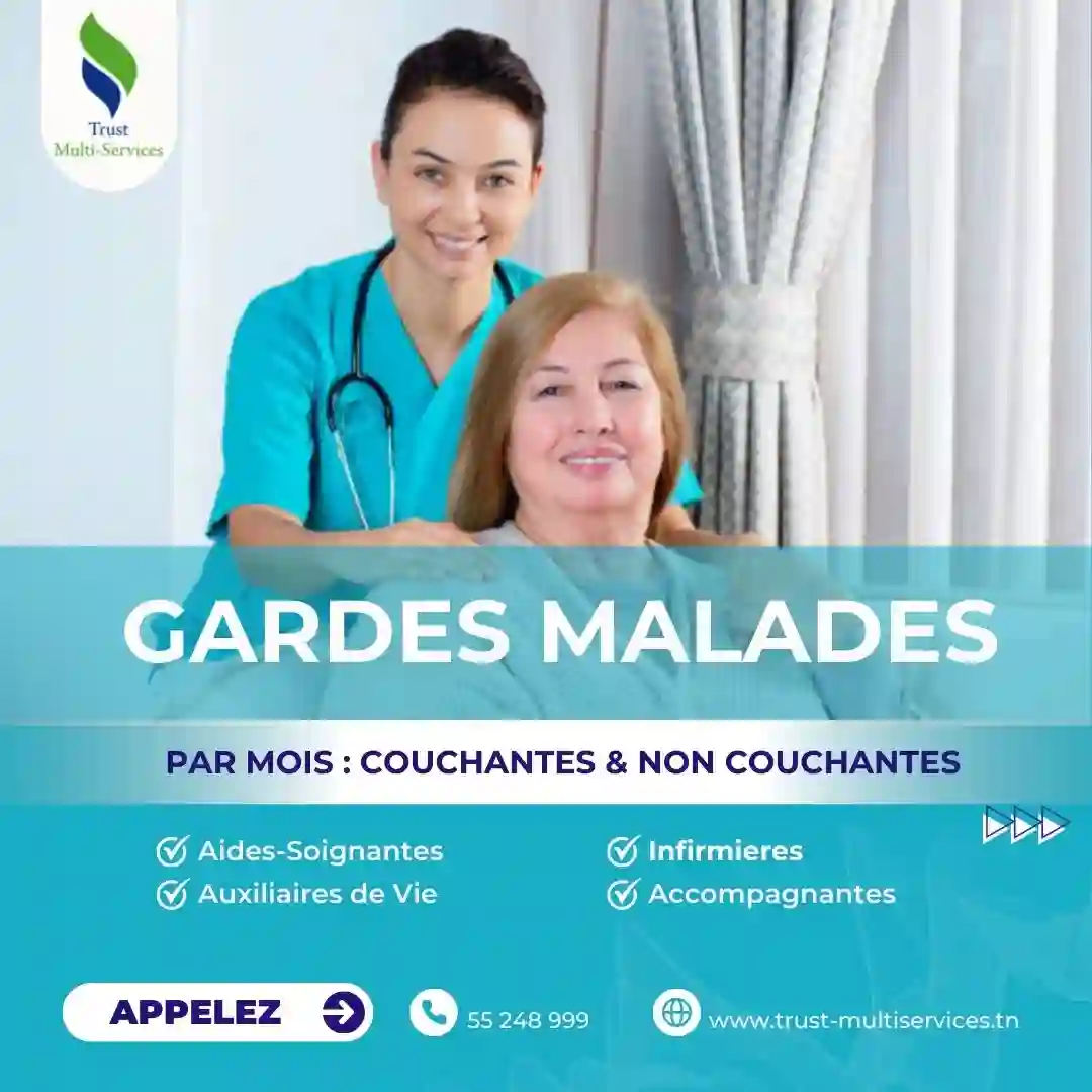 "Trust Multiservices met votre disposition des professionnelles pour accompagner des personnes malades et présenter un service d’aide à domicile en fonction de leurs besoins. Contactez : 55248999 - 24266000 https://www.trust-multiservices.tn/ "