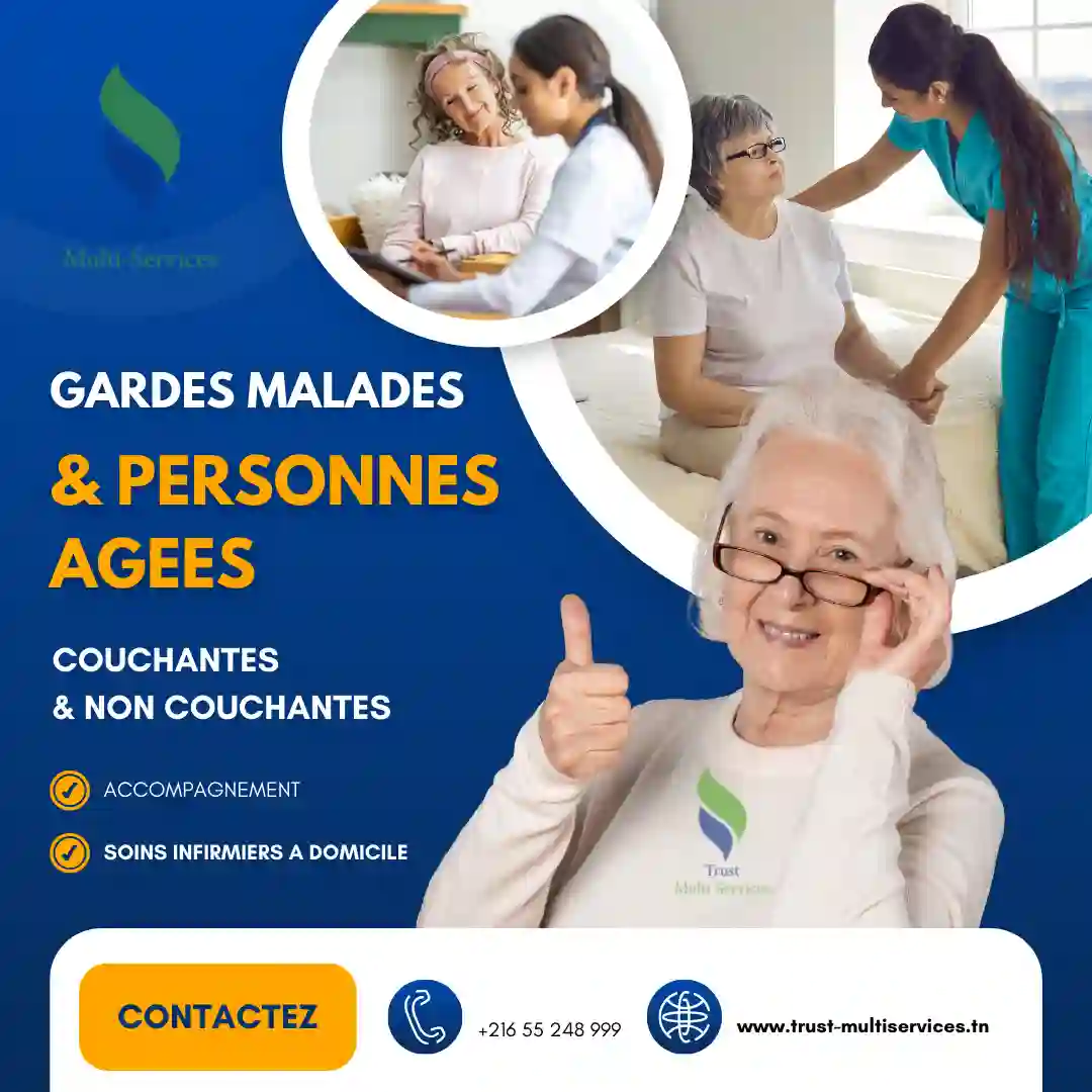 "🏡 Prendre soin de vos proches, comme si c'était les nôtres. Vous cherchez une solution fiable et humaine pour veiller sur un parent âgé à domicile ? En Tunisie, notre service de garde de personnes âgées à domicile vous offre sérénité, sécurité et soutien au quotidien. 👵👴 Accompagnement personnalisé, présence bienveillante Nos auxiliaires de vie qualifiés assurent une présence rassurante jour et nuit, avec un suivi adapté aux besoins de chaque senior : aide au lever, à la toilette, prise des médicaments, repas, promenades et compagnie. ✅ Pourquoi choisir notre service ? ✔ Personnel formé et expérimenté ✔ Assistance 24h/24 et 7j/7 ✔ Respect, dignité et écoute au cœur de nos valeurs ✔ Interventions sur tout le territoire tunisien Offrez à vos proches le confort de rester chez eux, entourés et en sécurité. 📞 Contactez-nous dès aujourd’hui pour une évaluation gratuite à domicile. 📞55248999 – 24266000 www.trust-multiservices.tn 📍 Présents partout en Tunisie"
