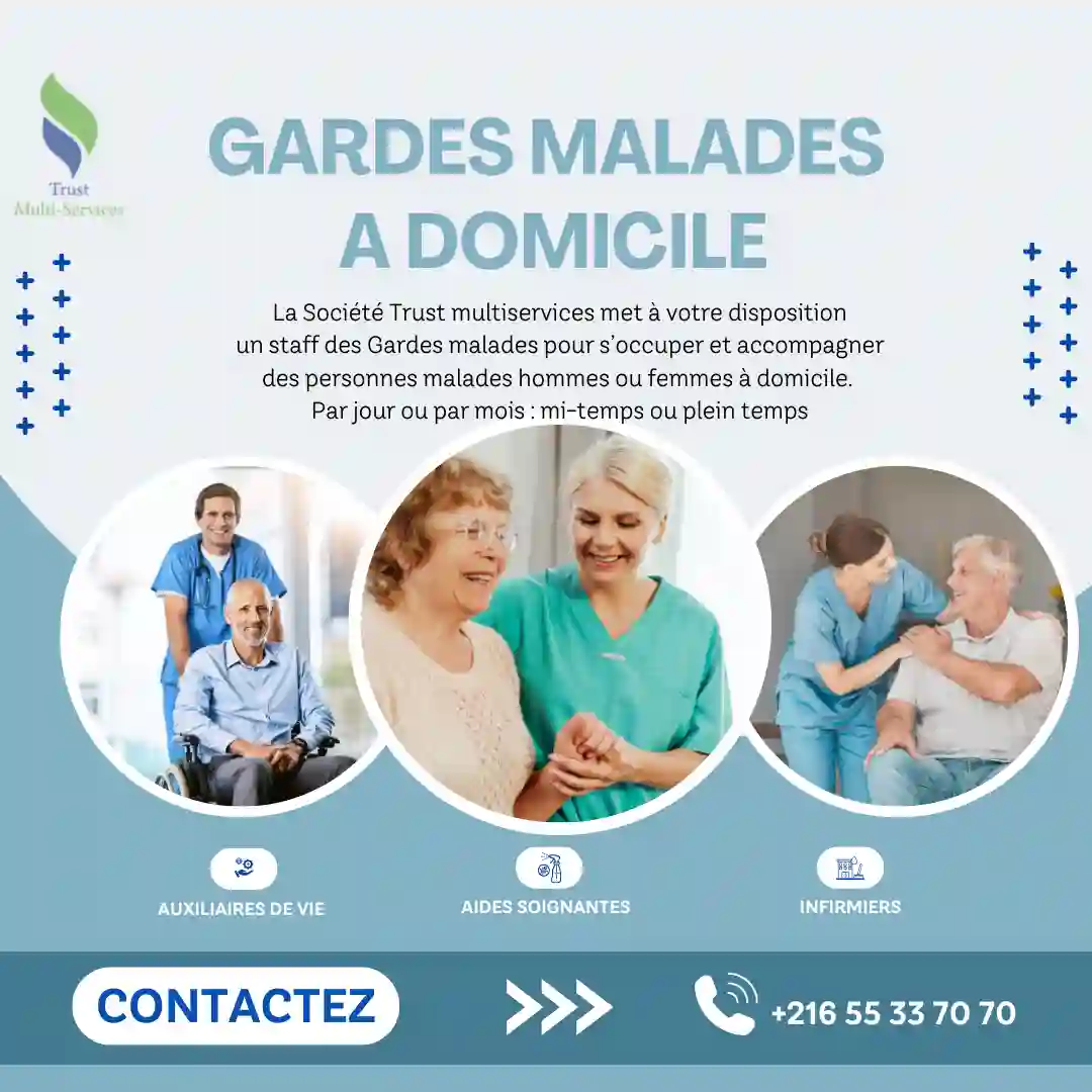 🏡 Prendre soin de vos proches, comme si c'était les nôtres. Vous cherchez une solution fiable et humaine pour veiller sur un parent âgé à domicile ? En Tunisie, notre service de garde de personnes âgées à domicile vous offre sérénité, sécurité et soutien au quotidien. 👵👴 Accompagnement personnalisé, présence bienveillante Nos auxiliaires de vie qualifiés assurent une présence rassurante jour et nuit, avec un suivi adapté aux besoins de chaque senior : aide au lever, à la toilette, prise des médicaments, repas, promenades et compagnie. ✅ Pourquoi choisir notre service ? ✔ Personnel formé et expérimenté ✔ Assistance 24h/24 et 7j/7 ✔ Respect, dignité et écoute au cœur de nos valeurs ✔ Interventions sur tout le territoire tunisien Offrez à vos proches le confort de rester chez eux, entourés et en sécurité. 📞 Contactez-nous dès aujourd’hui pour une évaluation gratuite à domicile. 📞Contactez : 55337070 - 55226099 www.trust-multiservices.tn 📍 Présents partout en Tunisie