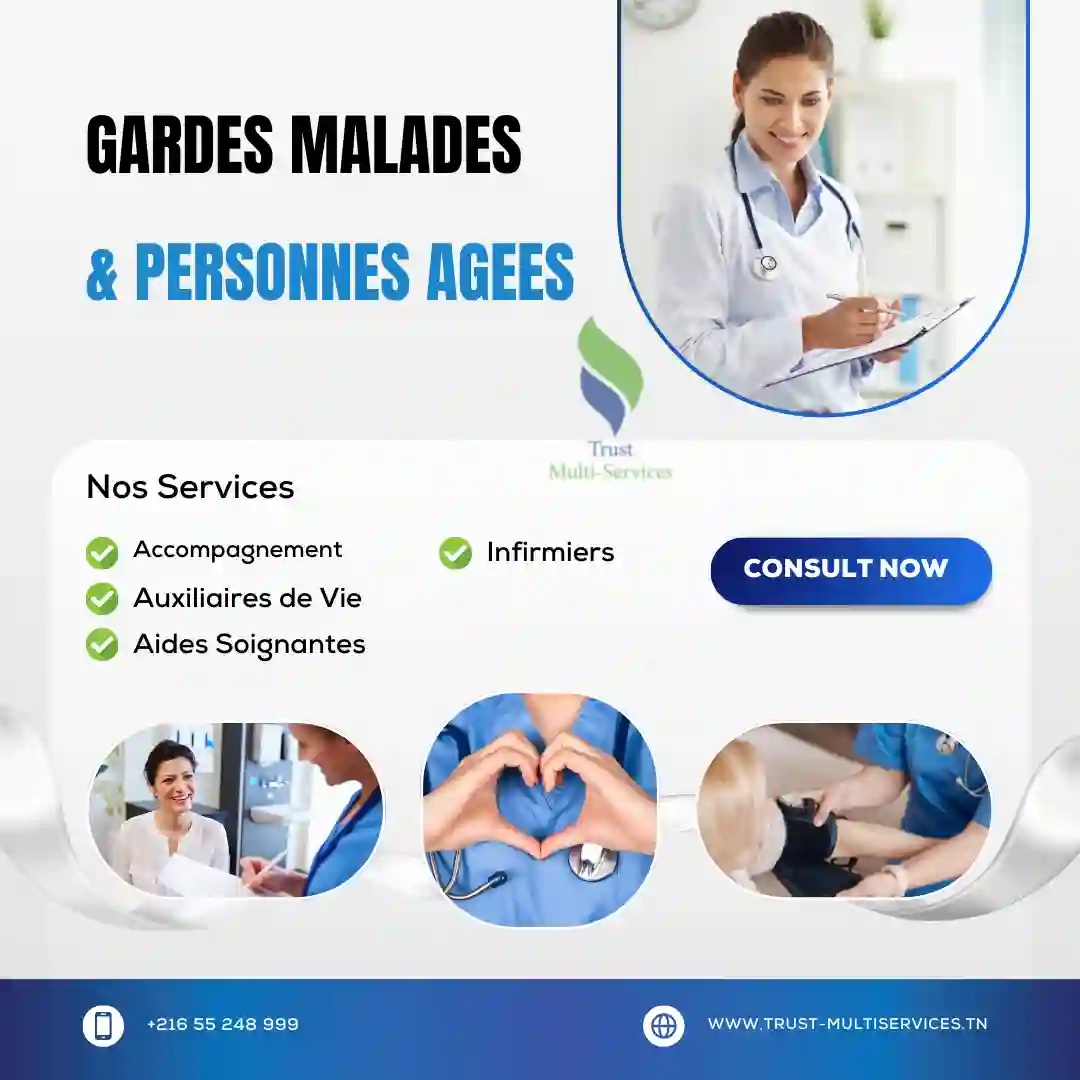 "🏡 Prendre soin de vos proches, comme si c'était les nôtres. Vous cherchez une solution fiable et humaine pour veiller sur un parent âgé à domicile ? En Tunisie, notre service de garde de personnes âgées à domicile vous offre sérénité, sécurité et soutien au quotidien. 👵👴 Accompagnement personnalisé, présence bienveillante Nos auxiliaires de vie qualifiés assurent une présence rassurante jour et nuit, avec un suivi adapté aux besoins de chaque senior : aide au lever, à la toilette, prise des médicaments, repas, promenades et compagnie. ✅ Pourquoi choisir notre service ? ✔ Personnel formé et expérimenté ✔ Assistance 24h/24 et 7j/7 ✔ Respect, dignité et écoute au cœur de nos valeurs ✔ Interventions sur tout le territoire tunisien Offrez à vos proches le confort de rester chez eux, entourés et en sécurité. 📞 Contactez-nous dès aujourd’hui pour une évaluation gratuite à domicile. 📞55248999 – 24266000 www.trust-multiservices.tn 📍 Présents partout en Tunisie"