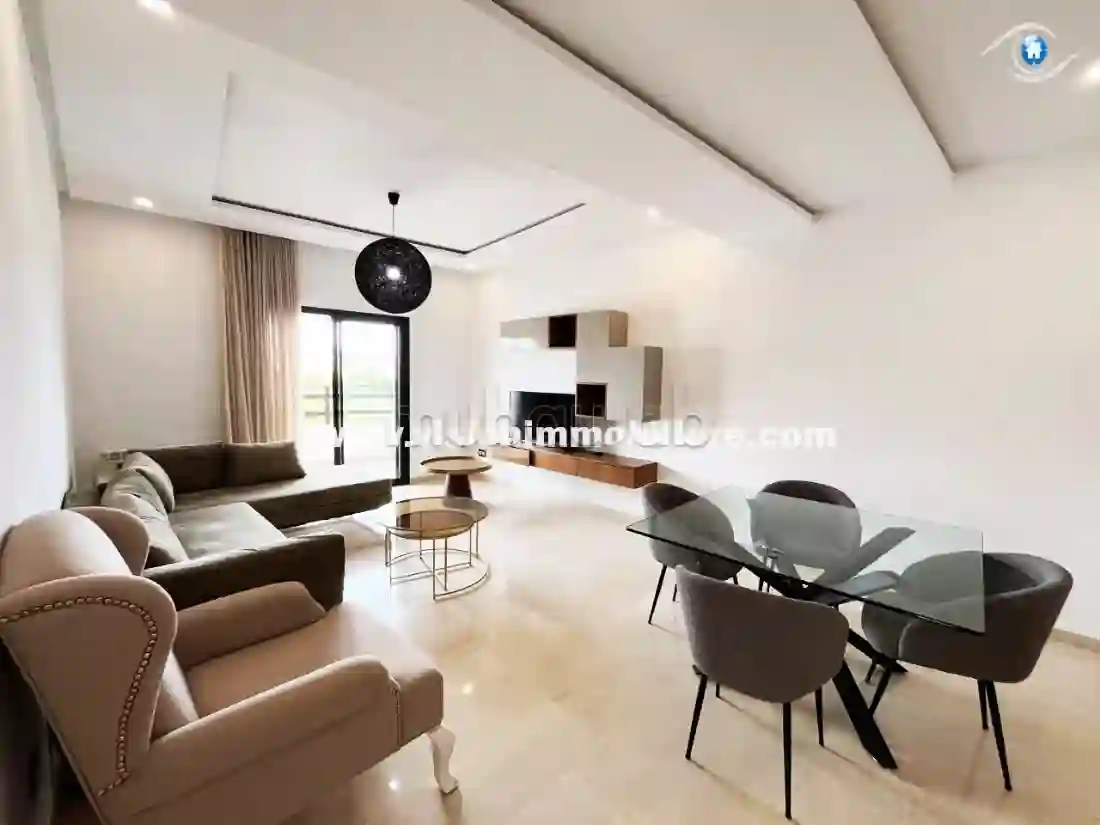 À louer, chez Vision-immobilière Hammamet-Tunisie ; pour toute l’année, cet appartement, qui se situe à Hammamet, centre au 1er étage dans un immeuble avec ascenseur. L'entrée principale donne sur un salon lumineux qui s'ouvre sur une terrasse, table a mangé et une salle d'eau. La cuisine équipée et aménagée par les éléments de rangement nécessaire. Le compartiment nuit à loge deux chambres à coucher. L'appartement est équipé par un système de climatisation et chauffage central.