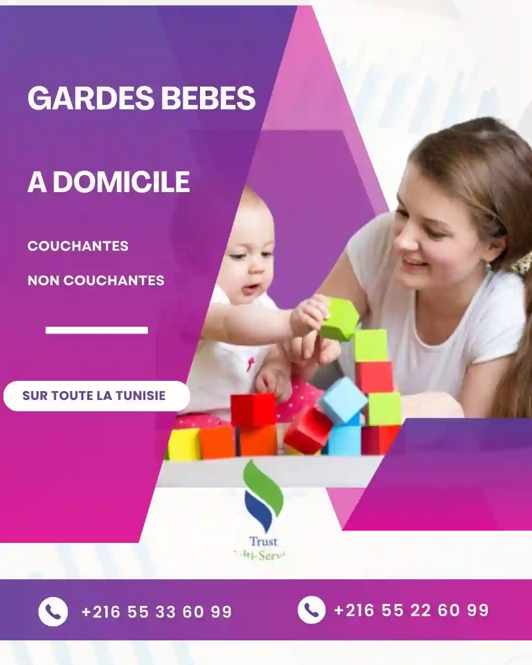 "Vous avez besoin d’une : Nounou à domicile, fiable et attentionnée, Pour veiller sur vos enfants pendant votre absence. Par mois (couchante ou non couchante) ? Ou Pendant les Week End / les Vacances ? Appelez le 📞 24. 606.405 📞 55.33.70.70 "
