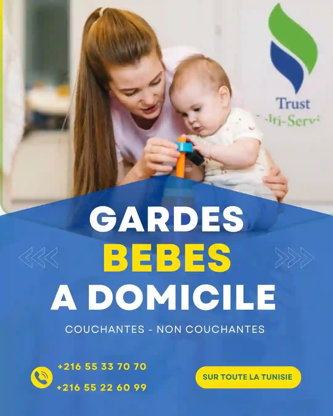 "Vous avez besoin d’une : Nounou à domicile, fiable et attentionnée, Pour veiller sur vos enfants pendant votre absence. Par mois (couchante ou non couchante) ? Ou Pendant les Week End / les Vacances ? Appelez le 📞 24. 606.405 📞 55.33.70.70 "