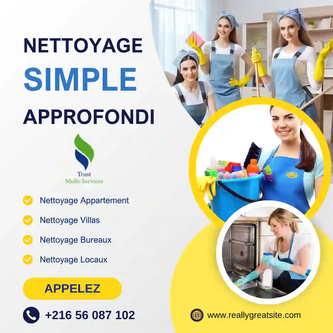 "Besoin d’un grand ménage , d’un nettoyage complet après travaux ou avant emménagement ? Faites confiance à Trust Multiservices, votre partenaire pro du nettoyage à domicile à Tunis ! ✨ Service rapide, soigné et fiable. 📞 Contactez Trust Multiservices : 56 087 102 – 24 266 000"